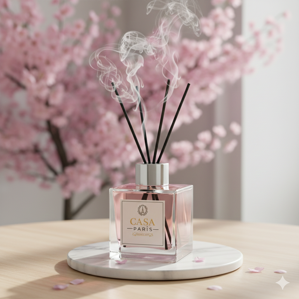 • Ambiance : L’arrière-plan, avec les fleurs de cerisier roses en pleine floraison, ancre clairement ce produit dans une thématique de fraîcheur, de renouveau, et de douceur florale. La fumée stylisée ajoutée aux bâtonnets accentue l’idée de diffusion du parfum.